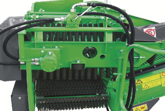 | Oddzielacz łęcin - specjalnie wyprofilowane pręty podają łęciny na gumowy wałek, który wciąga je i wyrzuca na pole. | Zgarniacz obiegowy (opcja) - regulowany hydraulicznie delikatnie zsuwa ziemniaki na stół przebierczy. | Zgarniacz wahliwy - regulowane mechanicznie dwie listwy zgarniają ziemniaki na stół przebierczy. |