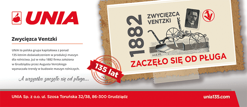 UNIA to polska grupa kapitałowa z ponad 135 letnim doświadczeniem w produkcji maszyn dla rolnictwa. Już w roku 1882 firma założona w Grudziądzu przez Augusta Ventzkiego wyznaczała trendy wbudowie maszyn rolniczych i jako pierwsza wprowadziła do produkcji kultywator oraz pług obrotowy. Na terenie Polski UNIA posiada 4 fabryki zatrudniające ponad 1100 pracowników które zlokalizowane są w: Grudziądzu, Słupsku, Brzegu oraz w Kątach Wrocławskich.
