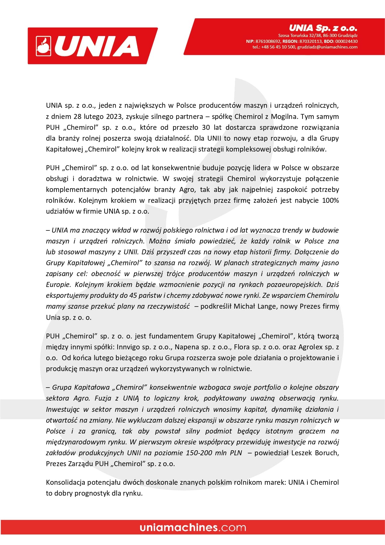 Unia zyskuje silnego partnera. Chemirol i Unia w jednej grupie kapitałowej.