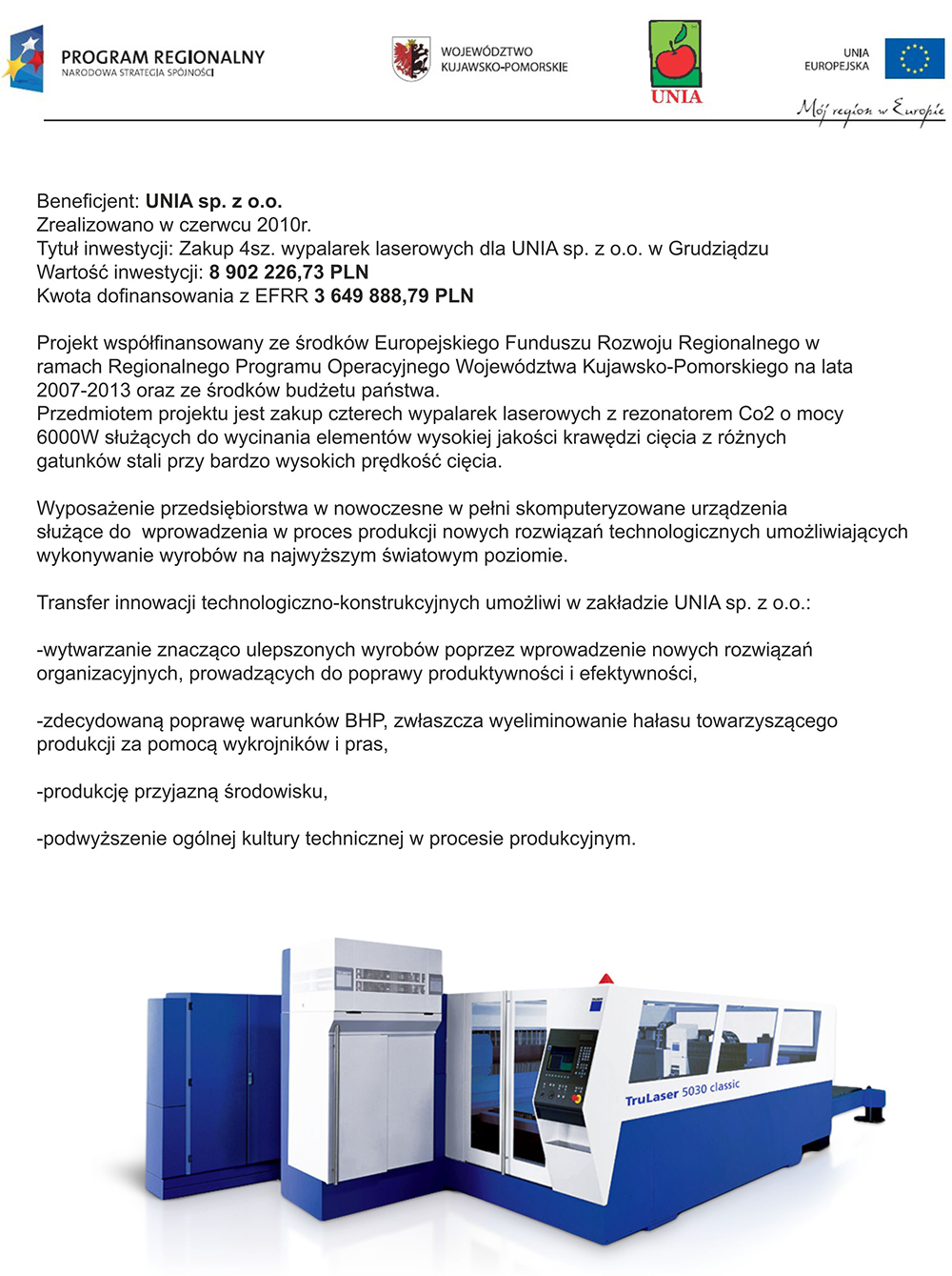 Zakup 4 szt. wypalarek laserowych dla UNIA sp. z o.o. w Grudziądzu
