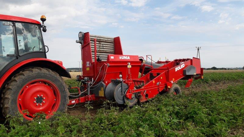 | Zgarniacz wahliwy Regulowane mechanicznie dwie listwy zgarniają ziemniaki na stół przebierczy. |