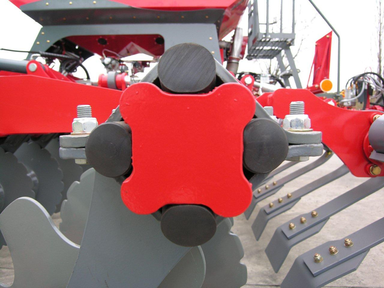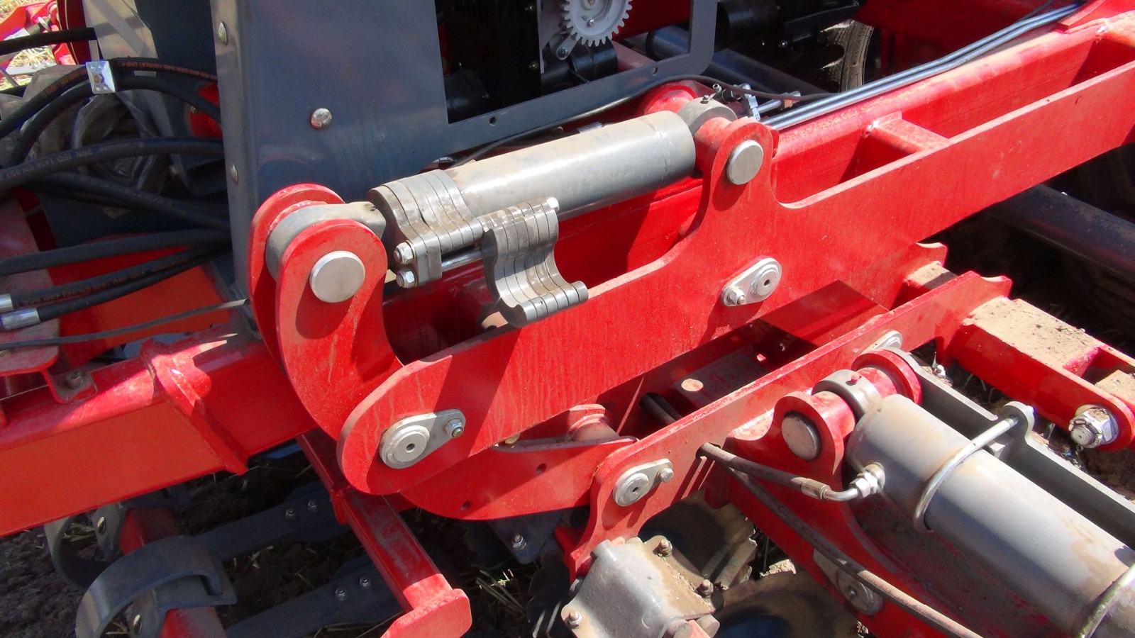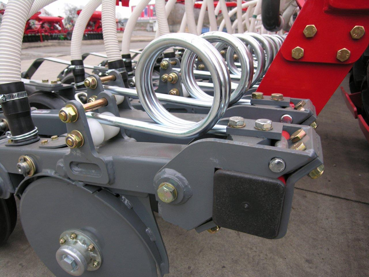 | Сошник двухдисковый V-образный ø350 мм. Максимальное давление P = 80 кг/сошник. Колесо копирующе-прикатывающее 330x50 мм | Передняя волокуша гидравлическая (опция) | Передний зацеп типа Packer (поворотный) ø800 мм. | Массивный сошник с простым управлением глубиной. |