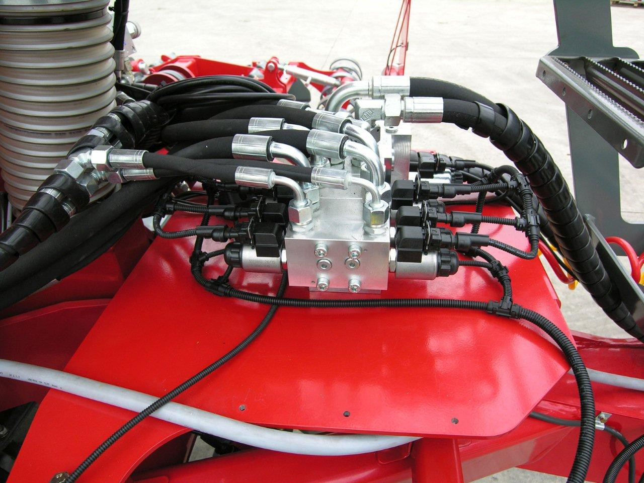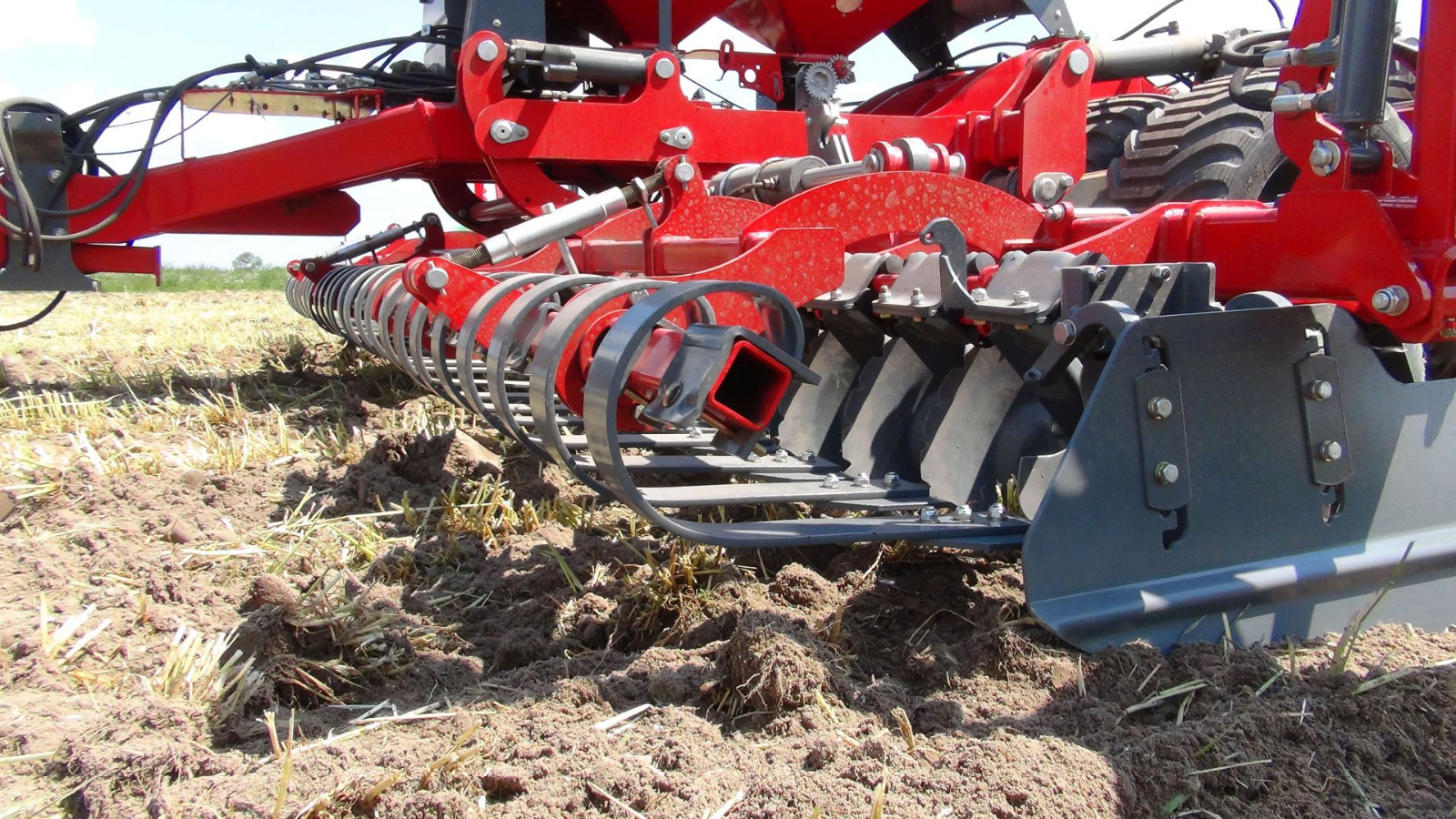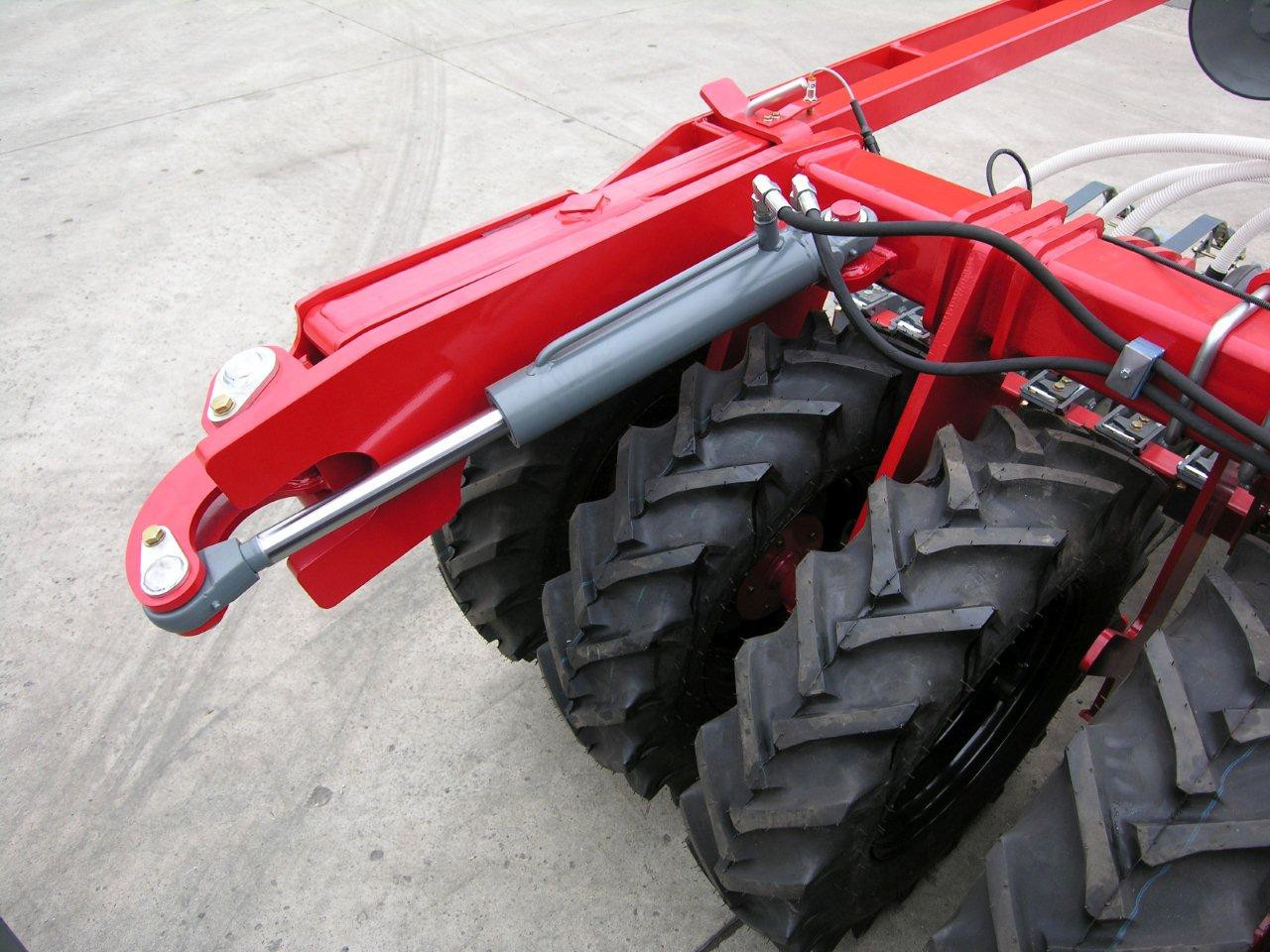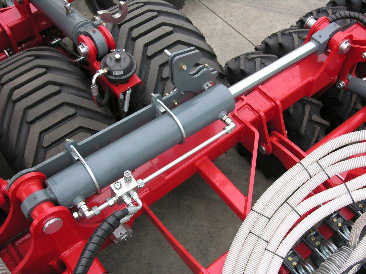 | Сошник двухдисковый V-образный ø350 мм. Максимальное давление P = 80 кг/сошник. Колесо копирующе-прикатывающее 330x50 мм | Передняя волокуша гидравлическая (опция) | Передний зацеп типа Packer (поворотный) ø800 мм. | Массивный сошник с простым управлением глубиной. |