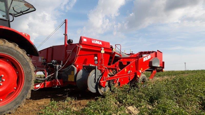 | Zgarniacz wahliwy Regulowane mechanicznie dwie listwy zgarniają ziemniaki na stół przebierczy. |