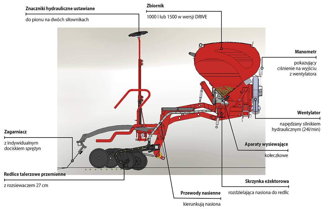 | Система FS. Дозирование зерна осуществляется с помощью высевающих аппаратов, обороты которых определяются с помощью бесступенчатой редукторной коробки. Дозированное количество зерна попадает в индивидуальные инжекторы, находящиеся в инжекторной коробке, откуда сжатый воздух берет их и переносит на сошник. |